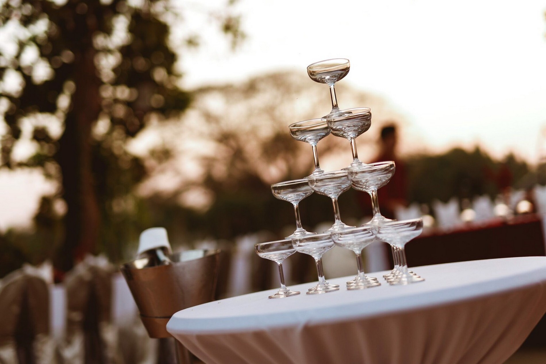 A romantic cabana will be set up on the River Lawn, decorated all around with white roses. The bride and the groom arrive to greet their friends and start the ceremony. Enjoy conversation among friends with sparkling wines and cocktails.